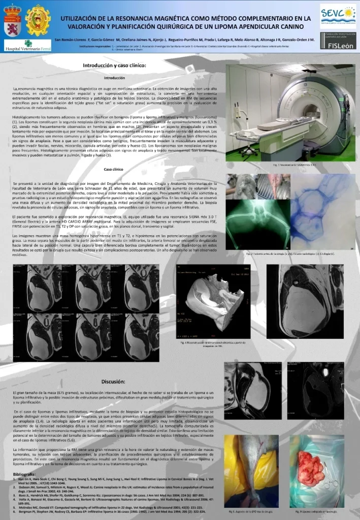 - San Román-Llorens F, García-Gómez M, Orellana Jaimes N, Regueiro-Purriños M, Prada-Areán I, Lafarga R, Melo Alonso B, Altonaga JR, Gonzalo-Orden JM (2011): Utilización de la resonancia magnética como método complementario en la valoración y planificación quirúrgica de un lipoma apendicular canino. Sourthern European Veterinary Conference. (POSTER)