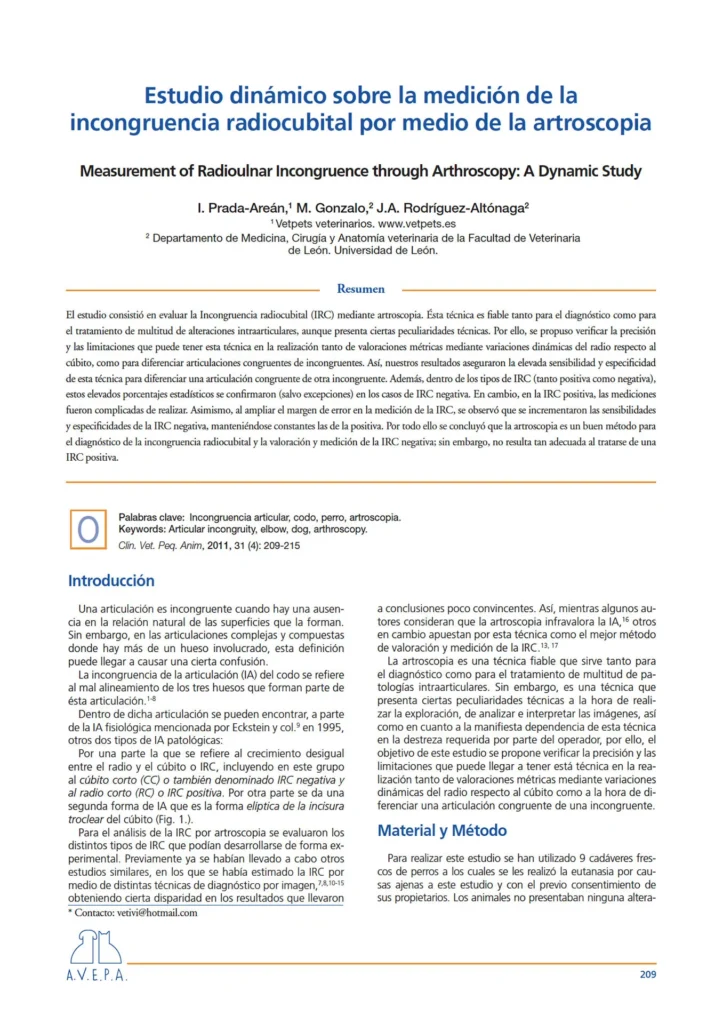 - Prada-Areán I., Gonzalo M., Rodríguez-Altónaga J.A. (2011): Estudio dinámico sobre la medición de la incongruencia radiocubital por medio de la artroscopia. Clínica veterinaria de pequeños animales; 31(4): 209-215
