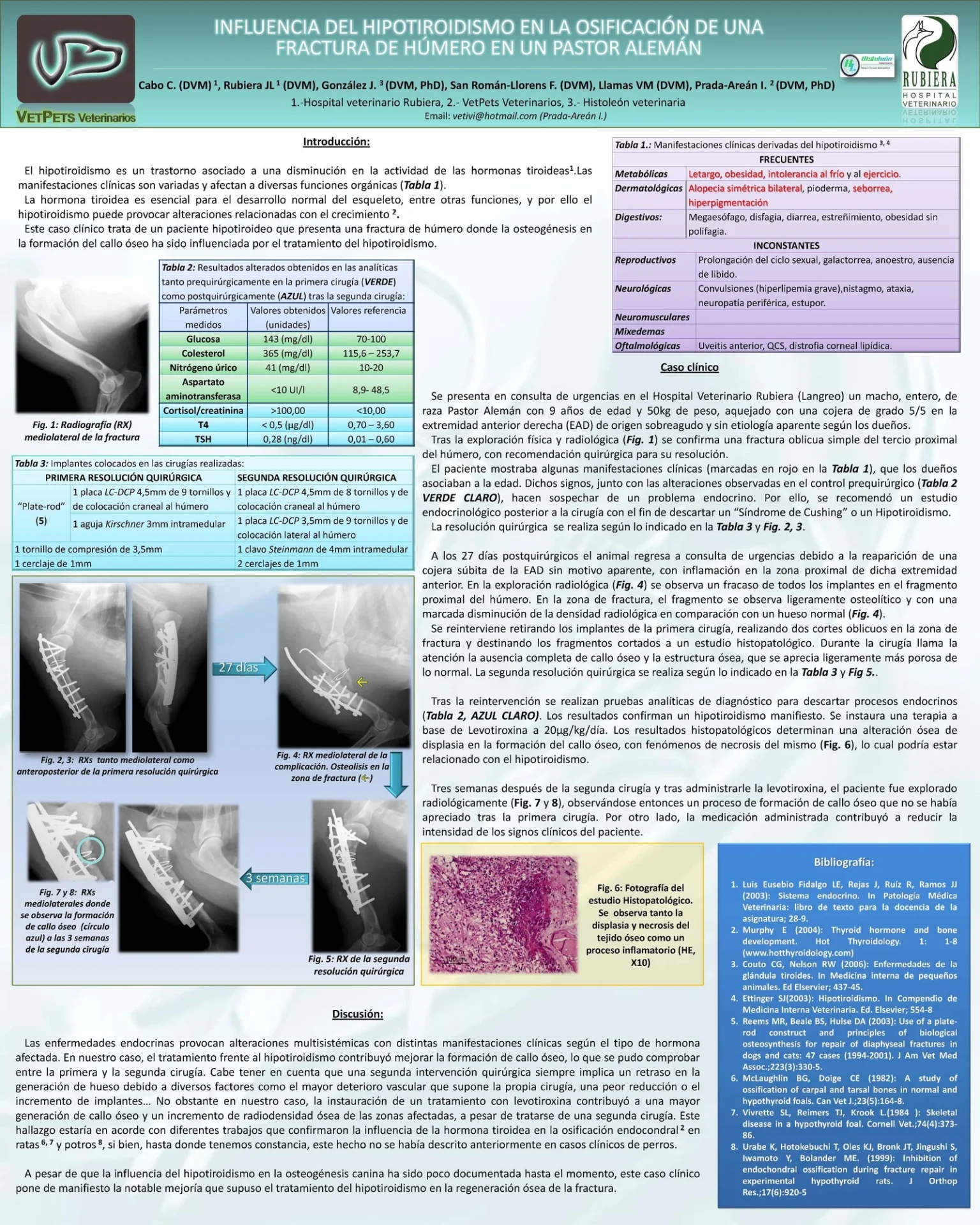 - Cabo C., Rubiera JL, González J., San Román-Llorens F., Llamas VM, Prada-Areán I. (2012): Influencia del hipotiroidismo en la osificación de una fractura de húmero en un Pastor Alemán. VII Congreso Hospital Veterinario Montenegro. Oporto (Portugal) (POSTER).